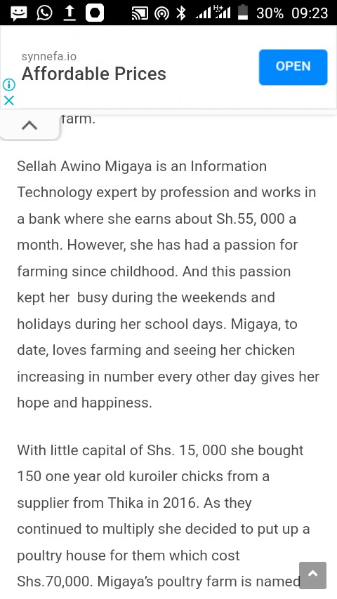 Awino currently enjoys farming and seeing her chicken population grow every other day gives her hope and happiness.