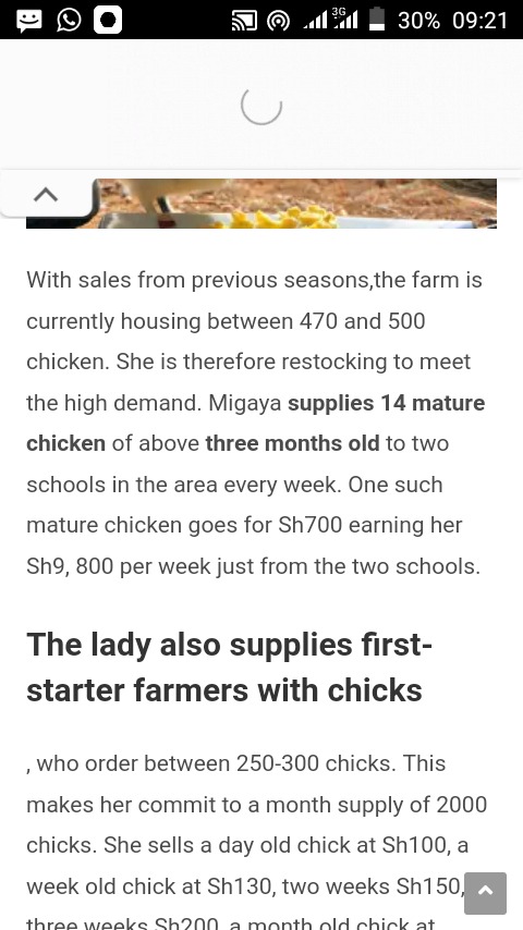 Every week, Awino delivers 14 adult chickens older than three months to two local schools. One adult chicken costs KES 700 and earns KES 9, 800 per week.