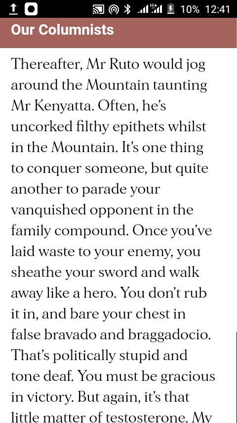 Mr Ruto, on the other hand, is a worthy political rival. He’s a calculated and strategic politician. Mr Ruto would crawl out from behind the rock if there was Noah’s flood and everything was destroyed. Unfortunately, his nine lives are coming to an end at the Mountain.